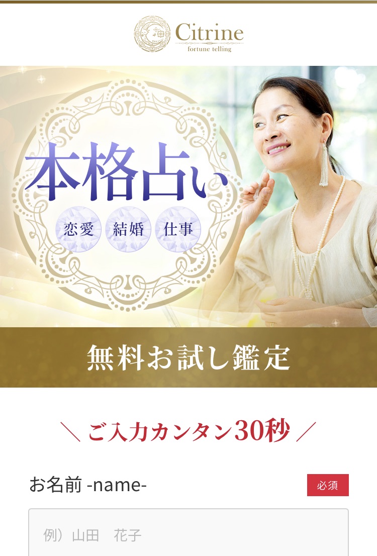 「Citrine」は、あらゆる悩みを解決する占いと銘打って高額な鑑定料を請求するサイトです。「姓名判断」、「タロット占い」、「風水」、「四柱推命」など、様々な占術を取り揃えており、豊富な占い師が在籍しているとされています。