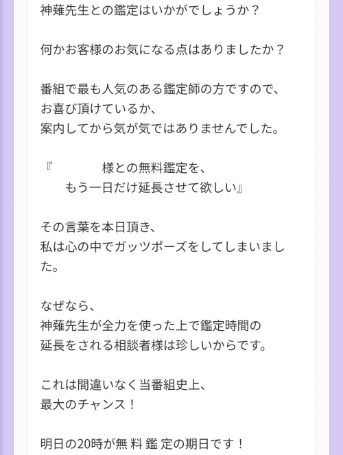 - 指定された文字を返送するよう指示する: 運営会社が作ったテンプレートの鑑定文でスムーズにやり取りできるように、文言を指定して返信させ、「ちゃんと鑑定している」と勘違いをさせ、満足感を与えるための手口です。